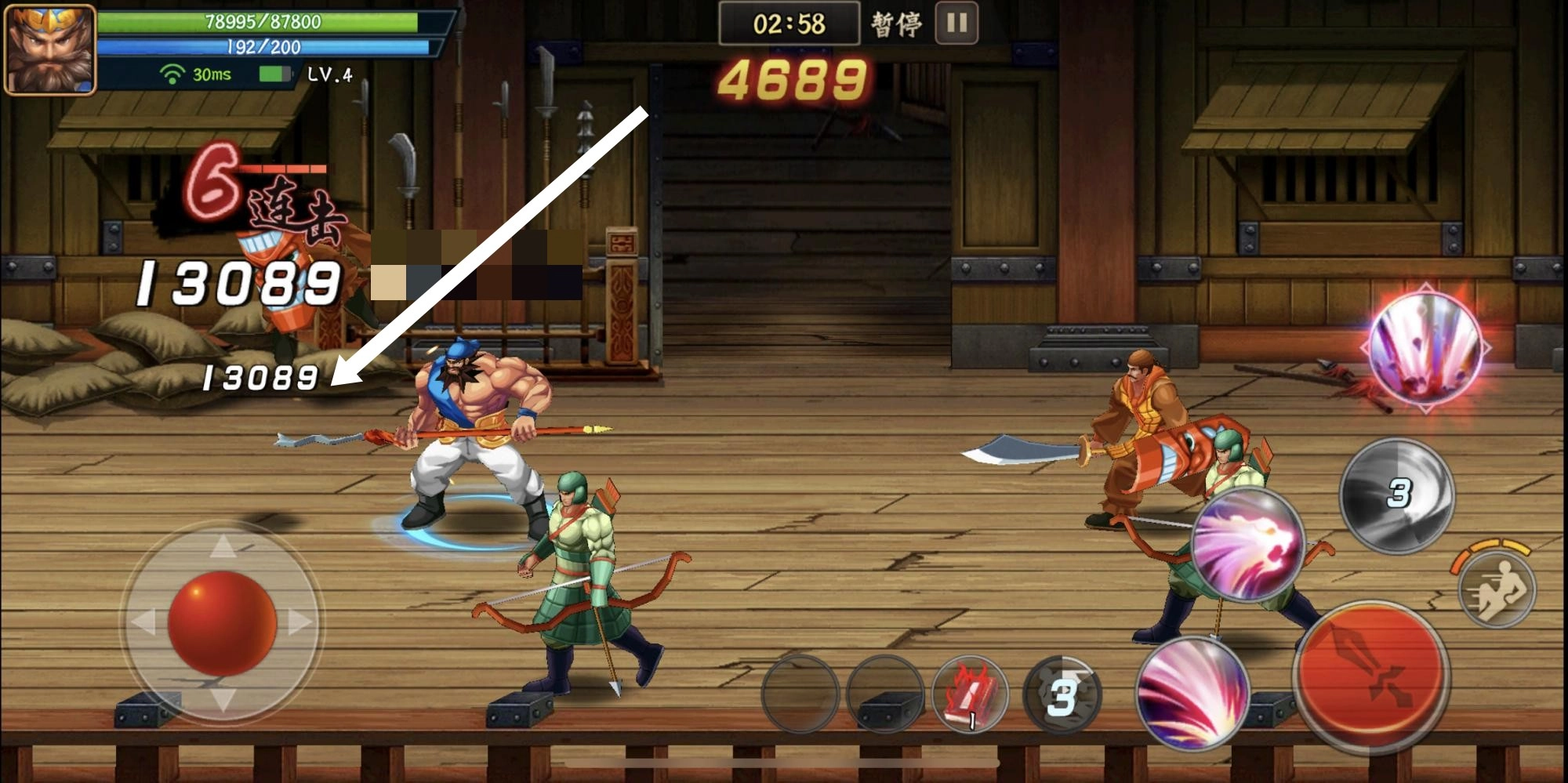 衔接上之后,快速消灭第一波3个长枪兵,触发弓箭兵的出现,第二波3个长枪兵则选择使用3A+冲刺,把连击数打上去。直到第四波弓箭兵出现之后,快速消灭然后往上进入地图。