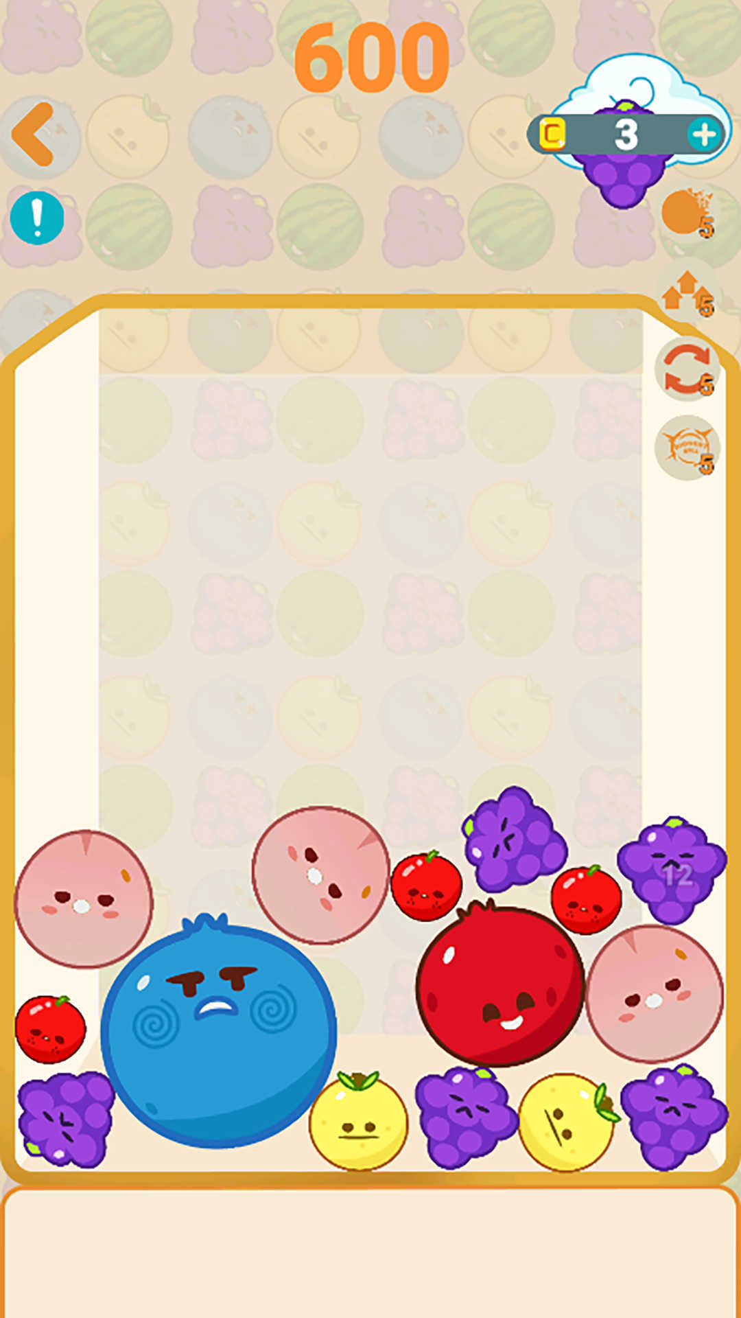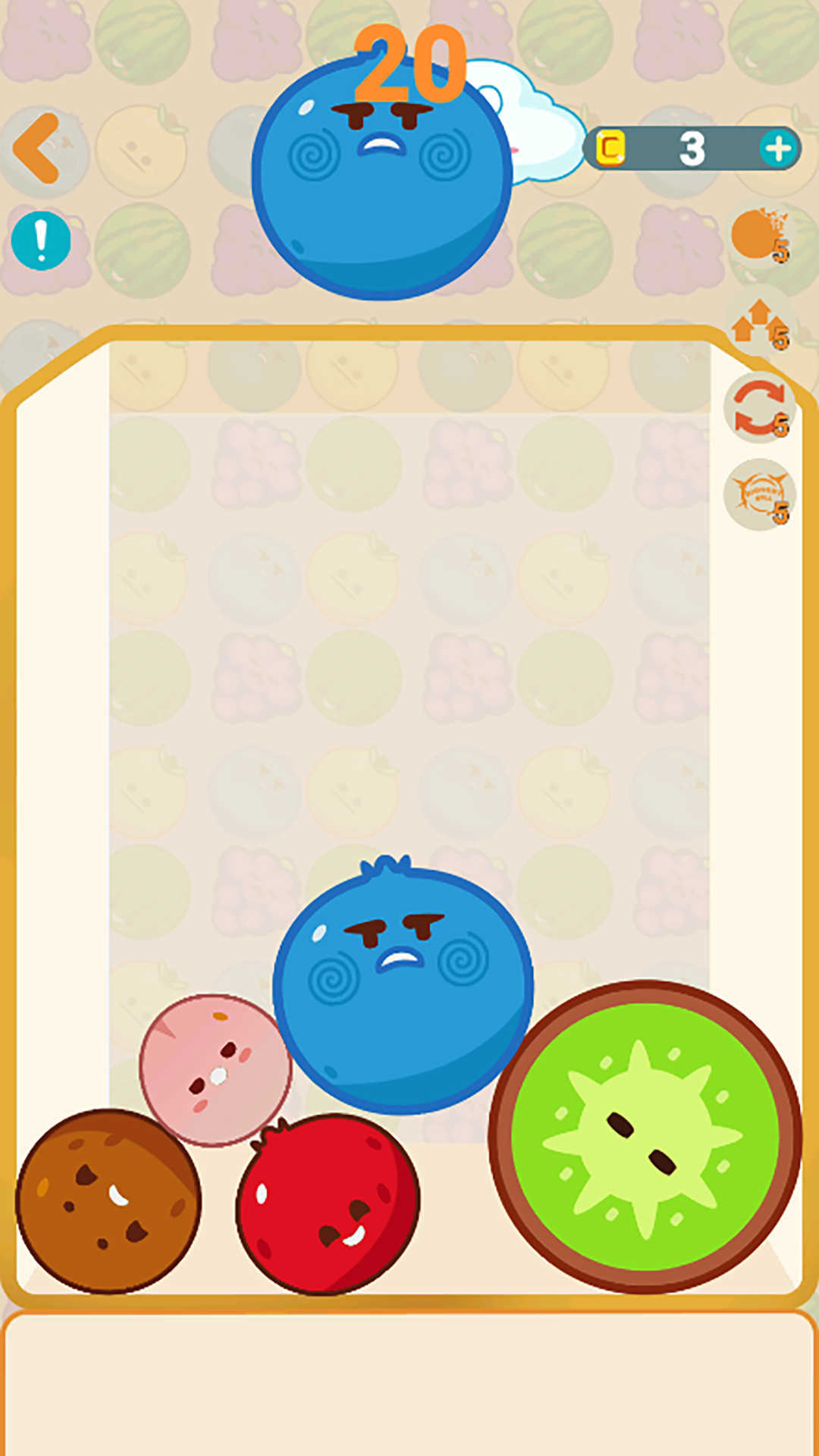 2、玩家合成水果越多,局面就越复杂,这时候玩家可以利用道具以此来帮助自己,让玩家可以减轻压力。