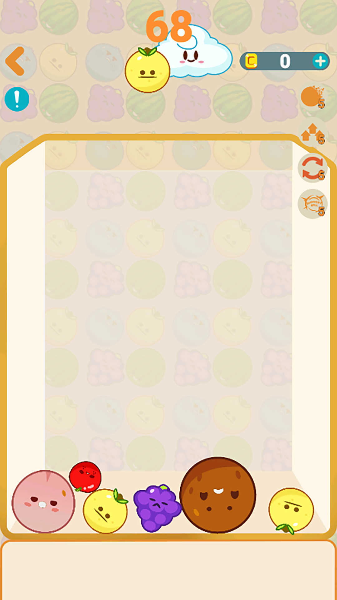 4、玩家需要让水果从高处下落,当两个水果靠近或碰到一起,就可以合成更高级的水果