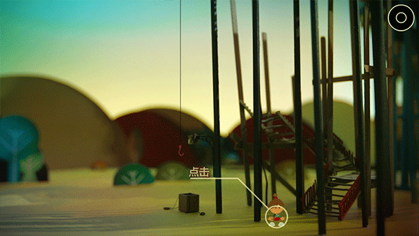 5、刚踏入城市就遇到了第一道关卡,卢米若想从这里上去,就得借助吊钩。先捡起前方地面上的小木棍放进包里,再打开背包将木棍拖到铃铛处敲响它,上面的人便会把你吊上去。