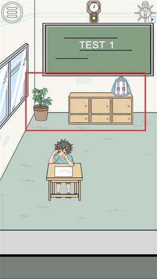 2、【TEST-1】关卡场景中,红框区域内包含绿植、储物柜、书包等物品,玩家需要借助这些物品来完成作弊任务。