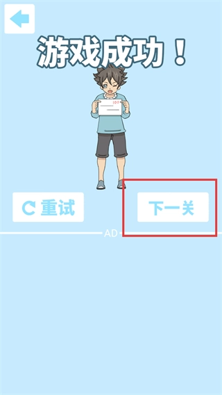 4、通过【TEST-1】关卡后会显示【游戏成功!】的提示,点击红框所标注的【下一关】按钮,即可进入后续的关卡挑战。