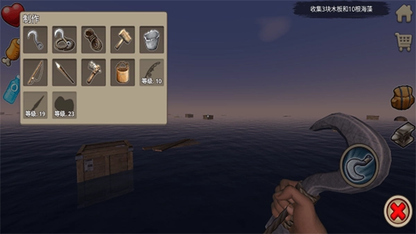 建造锤:用来扩展木筏,造成大船,具体作用后面会详细说明。合成:5木板,2废铁