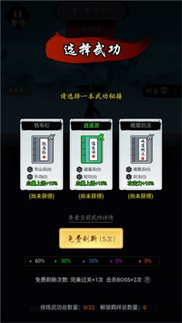 3、每次通过关卡都可以学习一个新的武学。