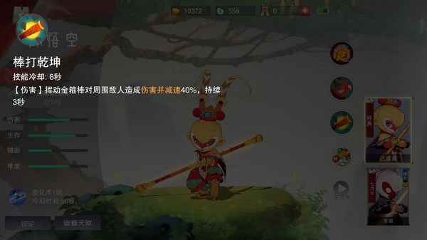 2、技能棒打乾坤 冷却8秒 【伤害】挥动金箍棒对周围敌人造成伤害并减速40%,持续3秒。