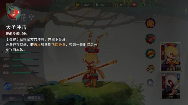 3、技能大圣冲击 冷却9秒 【位移】朝指定方向冲刺,并留下分身。分身存在期间,若再次释放则飞回分身,否则一段时间后分身飞回本体。