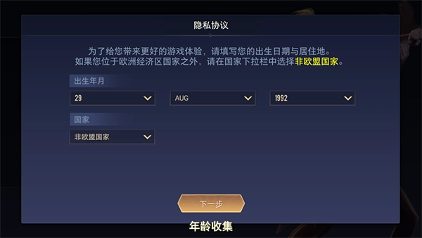 4、登录账号或游客进入游戏后,我们需要首先对国家以及年龄进行填写。注意:年龄不能过于偏小。