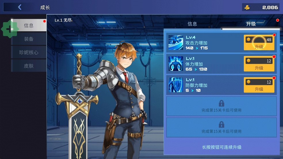 8、在“成长”模块中可查看角色的技能信息,对已解锁的技能进行升级与强化。