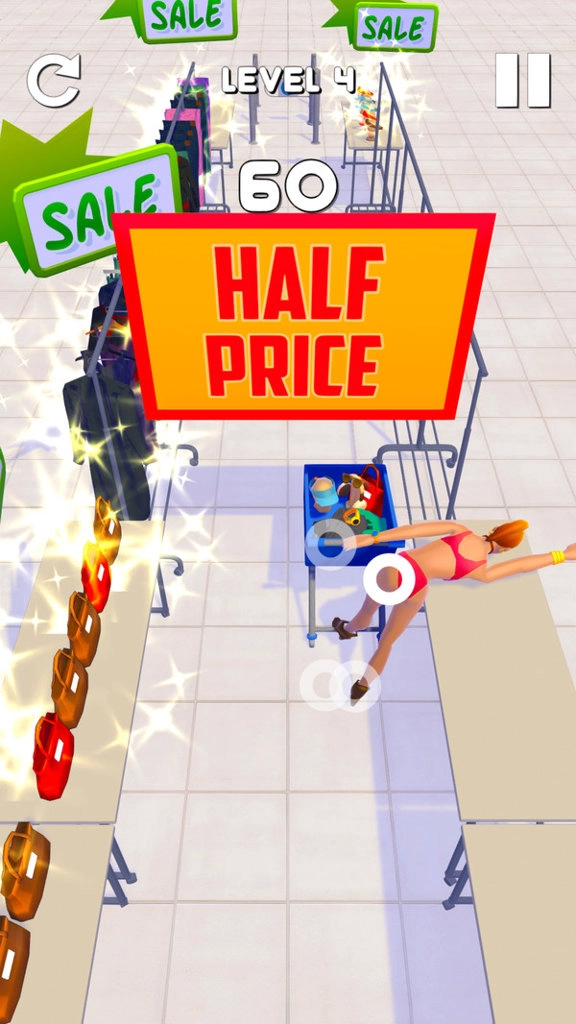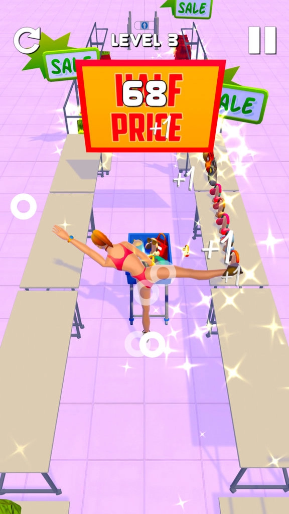 在这款游戏里,你得像个地道的购物能手那样反应迅速、动作敏捷。你可以通过左右滑动屏幕来操控角色移动,向上滑动能让角色跳跃以避开地面上的障碍,向下滑动则能让角色穿过那些低矮的货架。你要格外留意商场里的特殊区域:生鲜区的地面会时不时出现水渍,一旦踩上去就会打滑;服装区的衣架可能会突然倒下来挡住你的去路。游戏里还设有限时抢购的环节,只要在倒计时结束之前收集到指定的商品,就能获得额外的积分。千万记住,你不仅要跑得够快,更要捡得够准,要是漏掉了自己心仪的商品,可是会被扣分的哦!