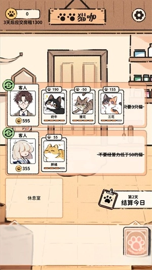 4、点击结算今日后可以完成顾客的订单获得猫猫币,每隔一段时间需要上缴一定的房租来完成任务,并且每完成一个订单猫猫们都会减少一点精力。