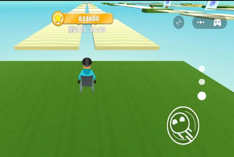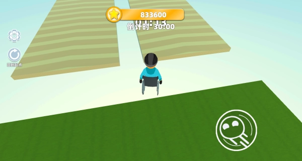 3、借助虚拟摇杆控制轮椅移动方向,根据赛道落差及时点击跳跃键,避免掉落赛道导致游戏失败。