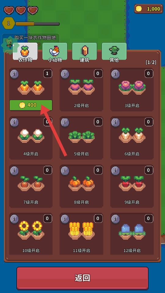 4、购买农作物田地,种植作物,获取资源,提升角色等级和收益。