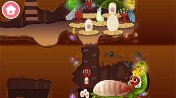 2、精心设计蚁后室、育儿室、储物室等蚂蚁巢穴功能区,通过拟人化的动画演示,让孩子直观理解蚂蚁社会的运行机制。