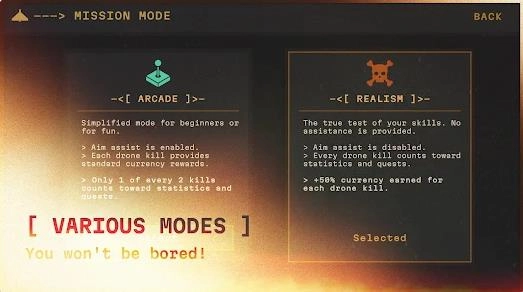 1、双模式挑战街机模式让你体验快节奏的爽快射击,真实模式则让你感受极限压力下的战术决策。 2、智能敌人系统无人机种类多样,有的高速掠过、有的投掷炸弹,还有的会分散干扰雷达锁定。 3、完全沉浸的操作体验通过移动炮塔、调整射角与使用热感追踪系统,带来极致的防空射击感。