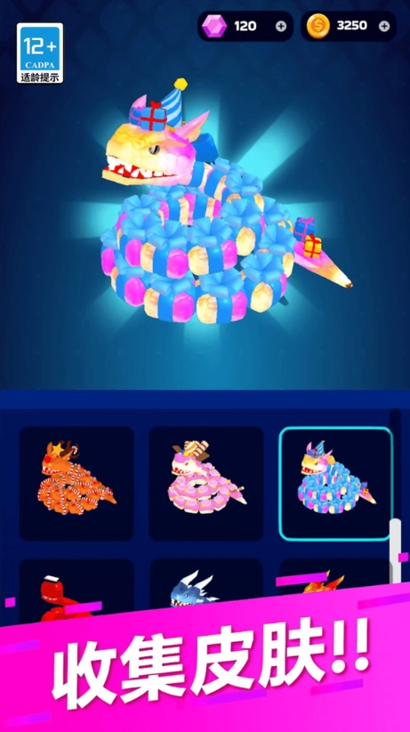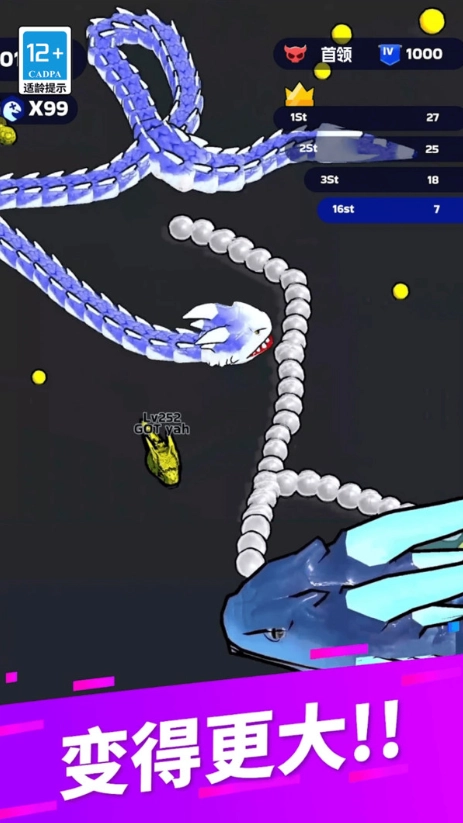 4、通过持续吞噬能量与战胜对手来提升等级、解锁技能,全力成长为赛场中最长的蛇,最终击溃所有对手赢得胜利。