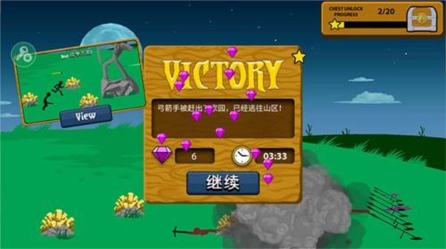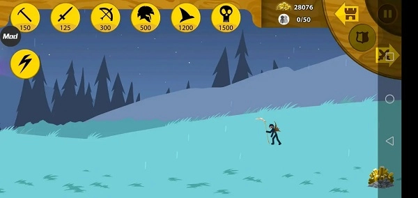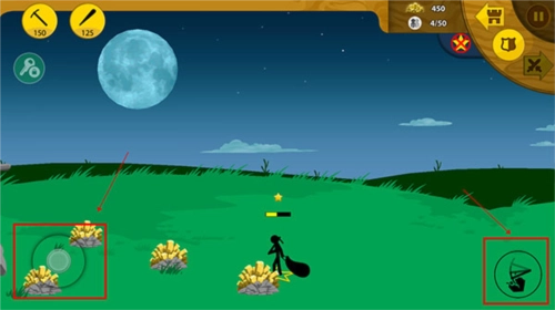 3、回到游戏后,我们可以通过屏幕右上角有三个按钮,向左的箭头按钮点击后,火柴人就会自动退守到基地后, 当敌人进攻时,弓箭手会自动攻击,并且也只有它可以攻击到敌人,不过如果玩家龟缩在基地,基地耐久也会掉哦。