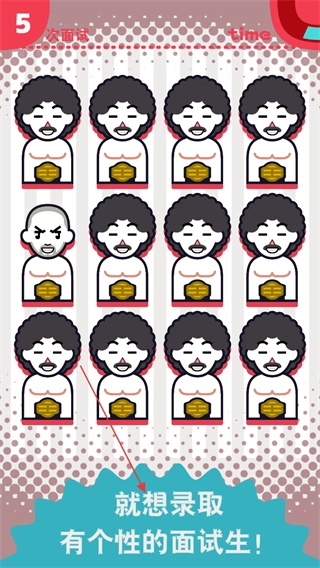 1、来到第5次面试环节,在一众形象相近的面试者里,找出形象与众不同的那位并点击选定,目的是招录富有个性的面试者。
