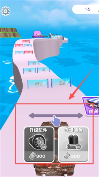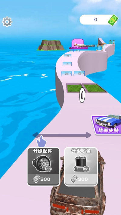 1. 借助虚拟方向盘以及油门、刹车来操控车辆,以精准的操作躲避赛道上的障碍物,同时收集散落在各处的改装零件与金币奖励。