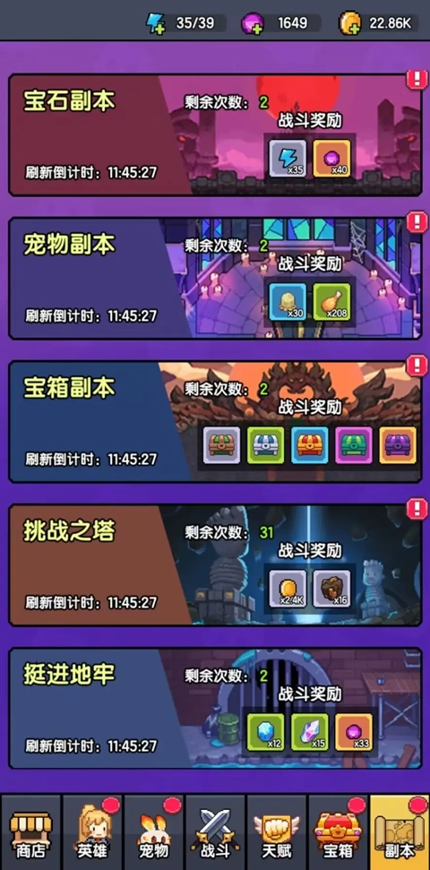每通关一层都会增加获得的体力和宝石,层数越高给的越多,每天有2次免费次数+2次广告次数,必须打满!
