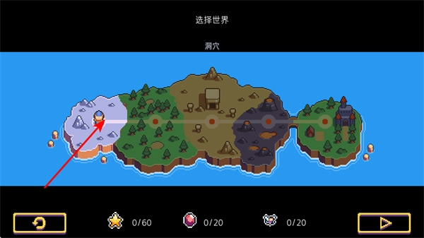 1、在世界选择界面,选择洞穴区域开启游戏,该区域为游戏的初始探索场景,能开启冒险之旅。