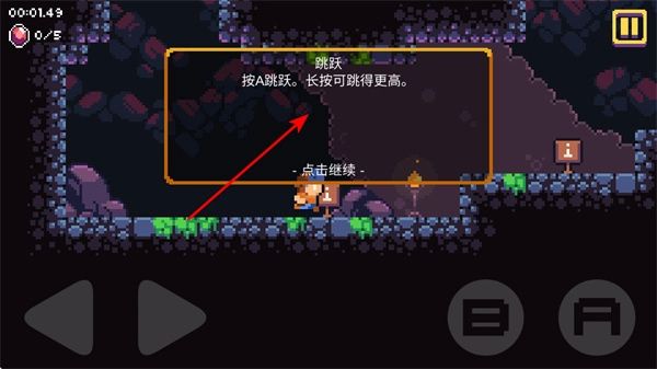 2、按A键可让角色跳跃,长按A键能跳得更高,这是角色在洞穴场景中移动和跨越障碍的基础操作。
