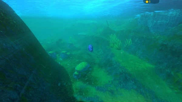 河流上游是非常危险的地方,这里是中型size的鱼儿聚居地,而且经常有Bonrex出没,所以你从瀑布飞下来时,就立马往前方的河道游去,借助狭窄的河道让你躲过追猎者的攻击。