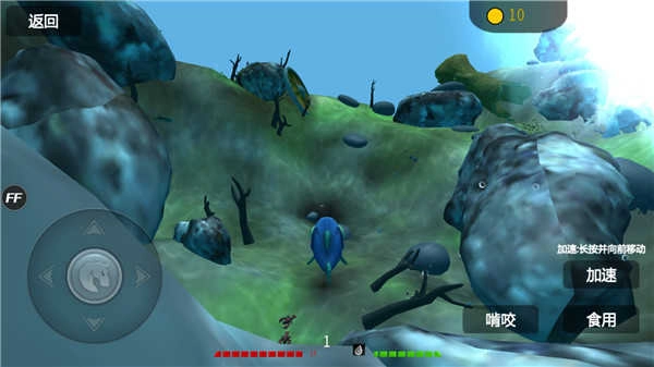 4、可以找一处地方蛰伏起来等待鱼类经过点击加速猛冲上去即可吃掉