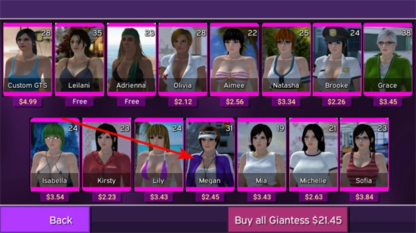 3、在角色选择界面,可选择如Megan等巨人角色,根据其价格形象特点,挑选自己角色进行游戏。