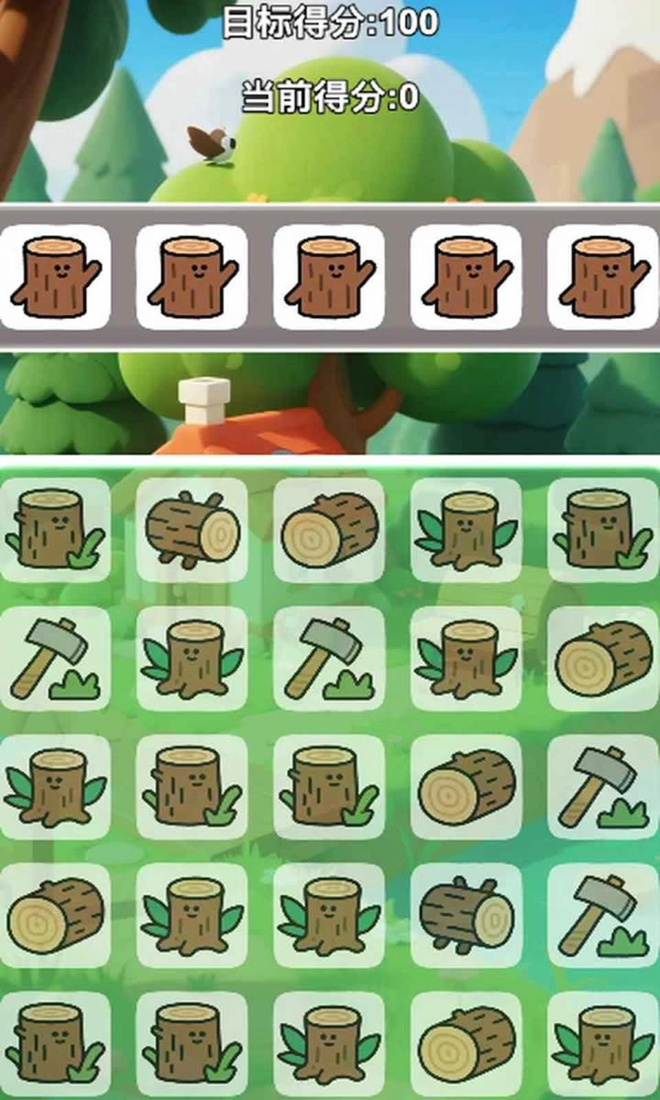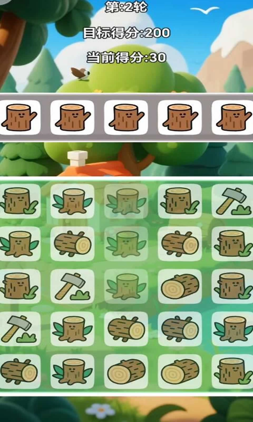 2、仔细观察当前关卡中分布的森林元素(如树桩、斧头、树枝等),寻找相邻或区域内的相同类型方块。