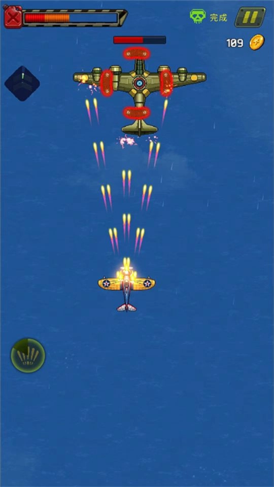 3、多样战机选择:提供数十架不同属性战机,每架战机拥有专属武器系统与必杀技,通过收集碎片解锁进阶机型,体验多种风格。