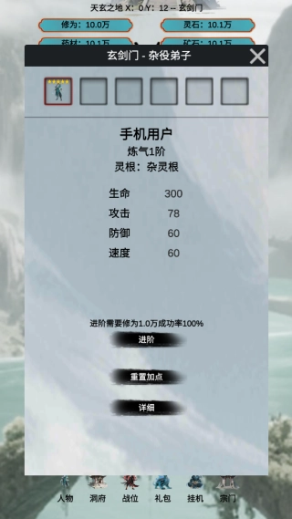 2、培养弟子提升境界,根据属性技能搭配阵容,应对不同挑战。