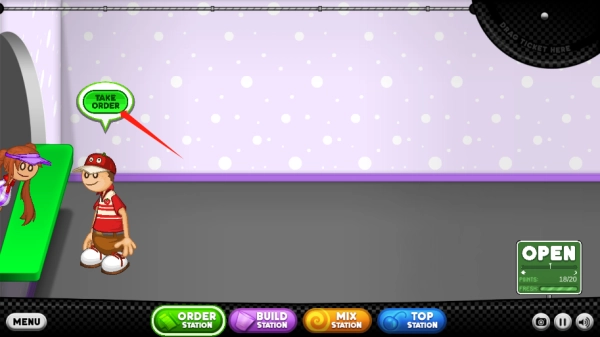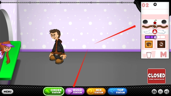 6、将顾客要求记下,点击build station,mix station,top station开始制作冰淇淋