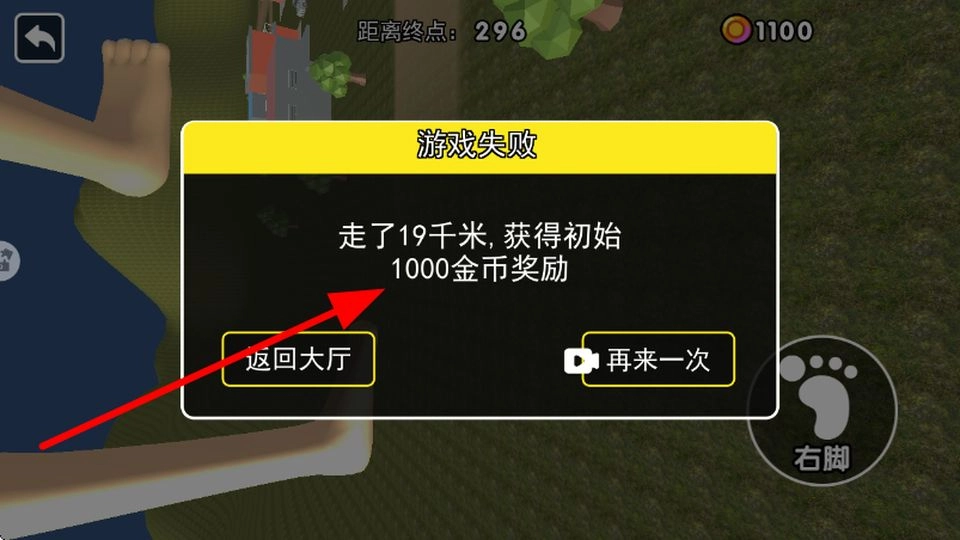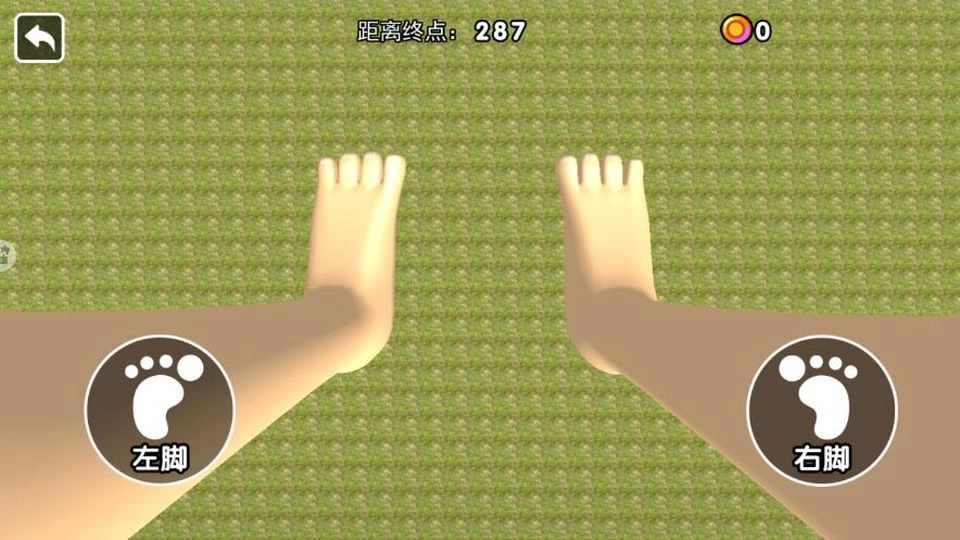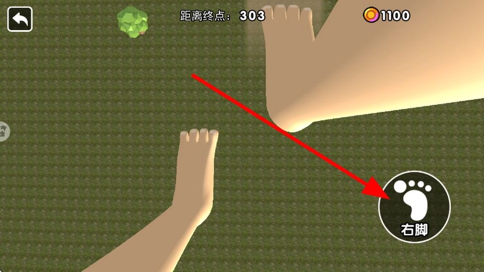 2、进入关卡后,会显示距离终点的距离,点击右脚按钮,控制右脚向前移动,迈出前进的步伐,逐步靠近终点。
