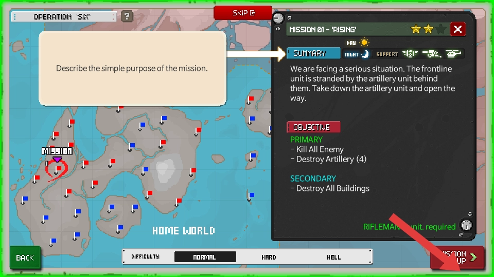 1、在战术射击游戏的任务选择界面,查看Mission01-Rising的任务目标,主要任务为歼灭全部敌人与摧毁4个炮兵单位。