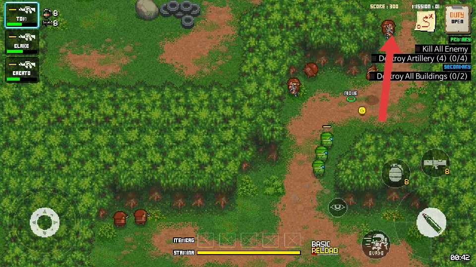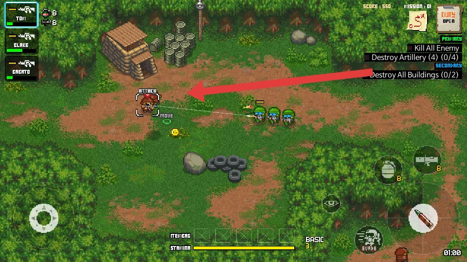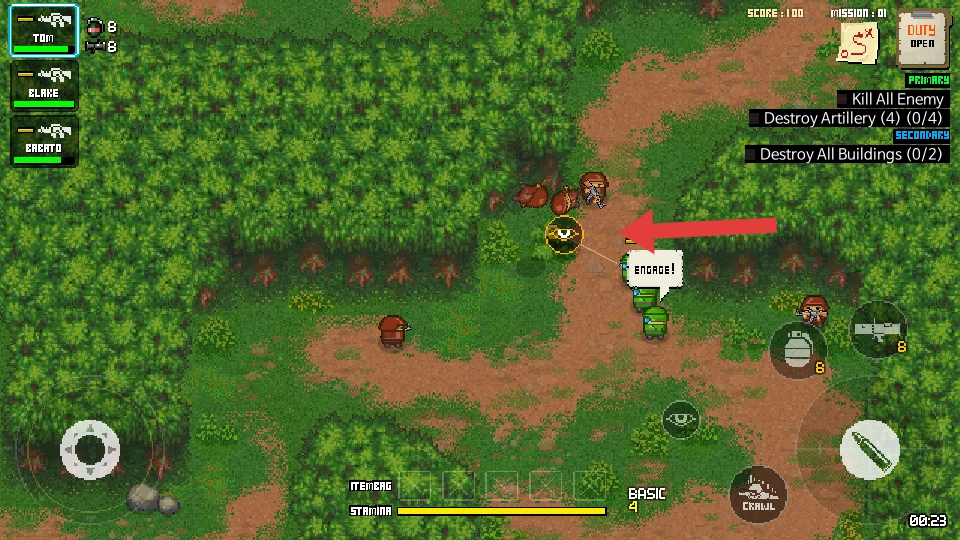 3、继续在丛林中移动,消灭沿途的敌方士兵,逐步向炮兵单位的位置推进,确保每一步都有效消灭敌人,创造条件。
