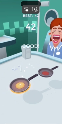 游戏里玩家得点击饼子持续翻转,按住屏幕就能让它飞进煎锅。