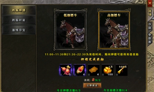 跨服押镖活动时间:11:00-11:30和21:30-22:30为双倍时间,期间押镖可获得双倍奖励,每日可以押镖3次。劫镖4次。押镖分为低级镖车和高级镖车。玩法介绍:玩家可以在活动开启后在NPC处领取镖车。押送镖车途中有可能会遇到其他玩家攻击镖车,玩家可以击杀对方保护自己的镖车。玩家也可以在活动地图内攻击其他玩家的镖车。摧毁镖车后可以获得劫镖奖励。