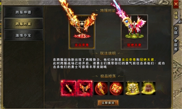 跨服时装活动玩法介绍:活动分为炎焱帝尊和冠绝天君两个BOSS,可进入跨服战场后玩家可以在BOSS刷新后击杀他们可以获得丰厚奖励。