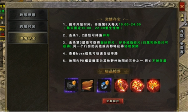 活动副本开放时间:开服第8天每天10:00-24:00(每天固定10:00,22:00重生怪物)击杀1层,2层怪可掉落碎布。击杀第三层怪可获得面纱碎片,护身戒指碎片(归属和协助均可获得)同一行会的其他成员都将获得协助奖励。查看BOSS信息可快速寻路,地图内PK爆装概率为其他野外地图的三分之一,死亡不掉狂暴。