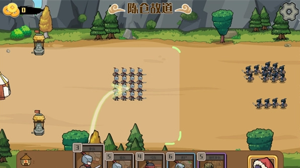 4、游戏操作简单,玩家需要等待下方粮仓的数字,达到兵种卡牌的数字,才可以出兵,当部队推平了敌方的阵营即可胜利。