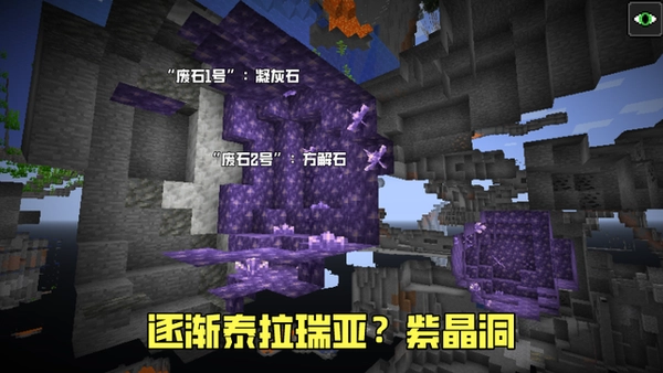 除此之外,紫晶洞是此次更新新增的地形结构,且大多相连生成,外层被凝灰石和方解石所包括(“三废石”喜获两枚兄弟)。