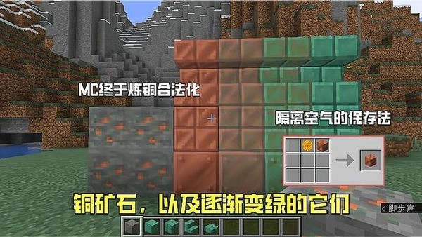 铜矿石与铁金材质类似,玩家使用石镐破坏后,便可获得。放入熔炉炼制后便会获得“铜锭”,9个铜锭可合成一个铜块,最大的特点也是mc建筑师最喜欢的一点——他们的合成物(半砖、楼梯)都会随着时间逐渐变绿(还好暂时没有铜头盔)。