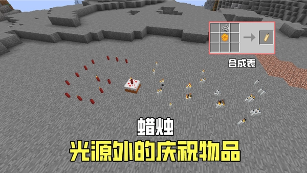 相比海底光源海泡菜,蜡烛几乎有着一模一样的特性,一格内可最多放置4根蜡烛,而不一样的是蜡烛可被染成16种颜色,且还能在蛋糕上摆放,同时需要打火石方可点亮。