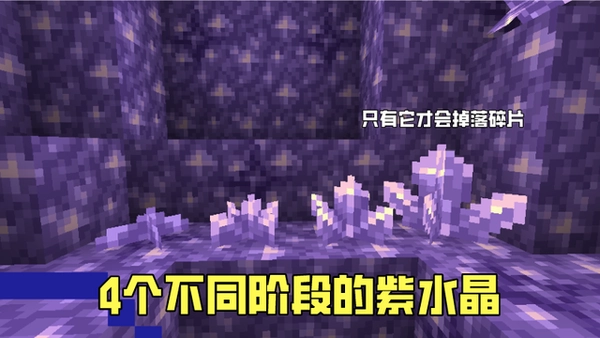 紫晶洞内的紫水晶芽床能发出悦耳声响,并会长出4种阶段的紫水晶(小型紫水晶芽、中型紫水晶芽、大型紫水晶芽、紫水晶簇),且只有采集最高等级的紫水晶簇才会掉落4个紫水晶碎片。