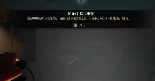 护元灯长按空格键可以探查找到隐藏的文字和脚印,这里跟随指引来到二楼电梯处,用护元灯驱散电梯门口的阴气。