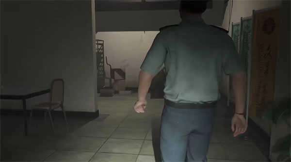 往右边蹲下过铁门来到教官室,看到教官在看电视,这里先别着急,等教官去查看电视的问题再移动。