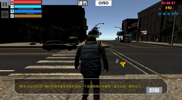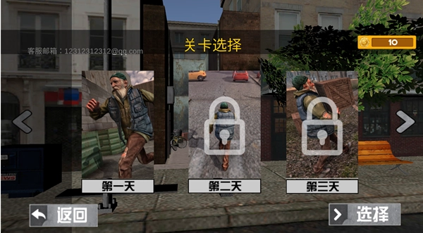 2、游戏的关卡按照天来分别,点击关卡点击选择等待一段时间,第1天-你必须在这个繁忙的城市里生存10天-找到一个合适的地方并要钱!奋力出击,保持活力;