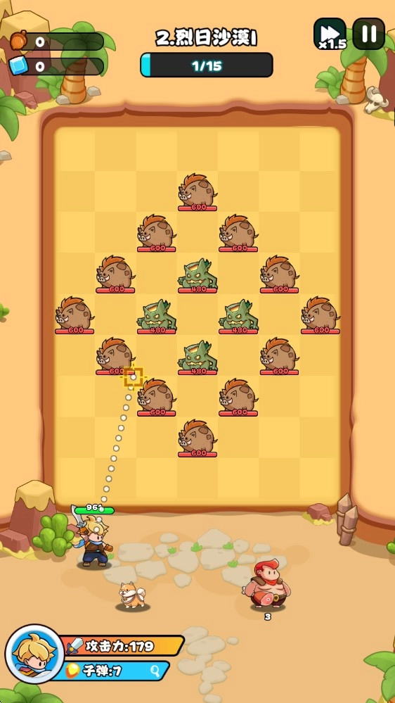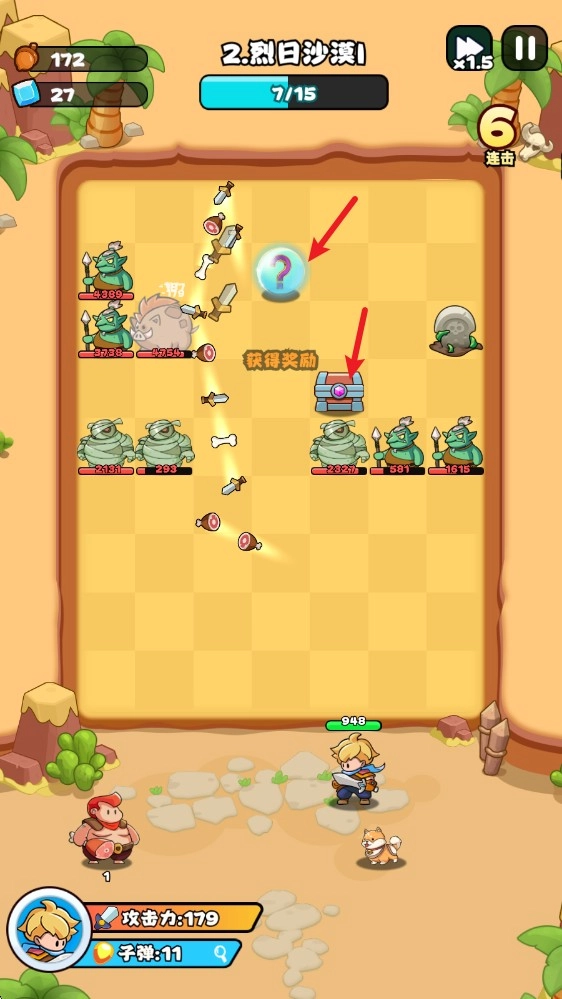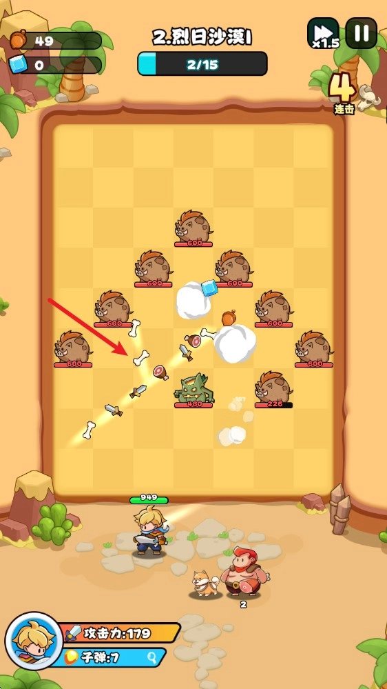 2、松手发射后,其他的伙伴也会跟随一起发射,发射的武器会在场地中弹射,对敌人造成伤害。
