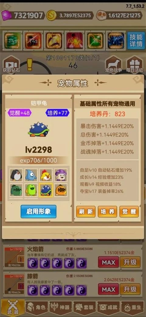 开局先刷装备掉落以及钻石自动上限,优先选双副属性相同的,累积20件为一套。随着关卡数和挂件等级逐渐提升替换。