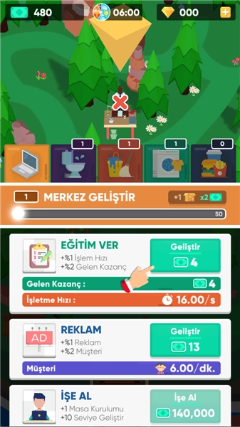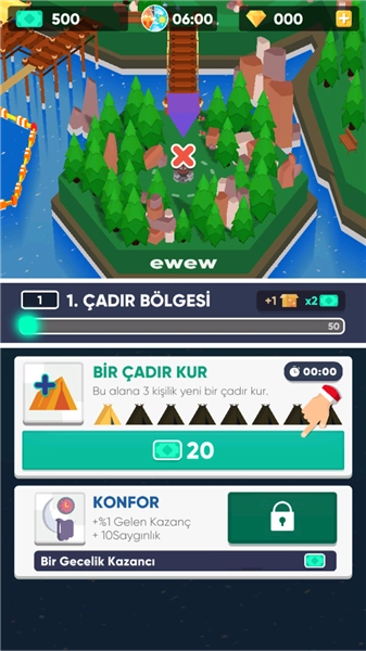 1、你将从一个帐篷开始发展,一天天开发各种建筑设施吸引顾客,同时也可以添加新的帐篷来增加你的露营帝国的接待容量。